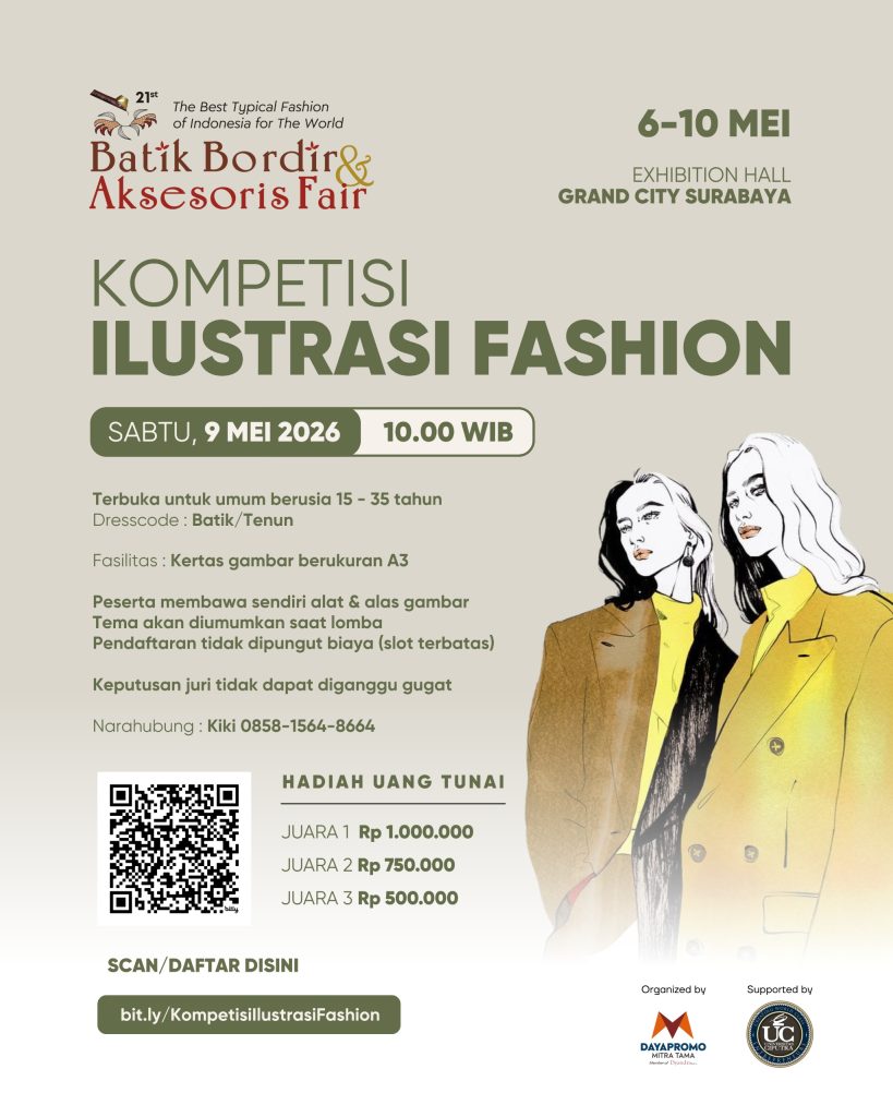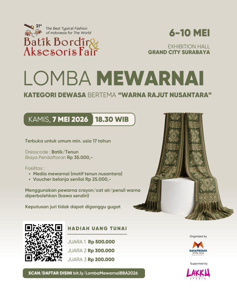 Dalam rangka memeriahkan HUT Dekranasda ke 46 tahun 2026, kembali kami gelar Batik Bordir dan Aksesoris Fair 2026 ke 21 kalinya. Di dukung sepenuhnya oleh Dekranasda Provinsi Jawa Timur, pameran ini merupakan ajang promosi berskala nasional bagi UMKM/Pelaku Industri Kreatif, perajin, mitra binaan Dinas Kab/Kota, Pemerintah provinsi, BUMN/BUMD untuk berpromosi dan mengenalkan produk, desain dan motif terbaru kepada konsumen secara langsung maupun produsen grosir. Selain itu masyarakat juga teredukasi mengenai wastra kriya Indonesia dan meningkatkan kecintaan pemakaian produk dalam negeri. Selain itu pameran ini juga turut memeriahkan HUT Kota Surabaya ke 733.